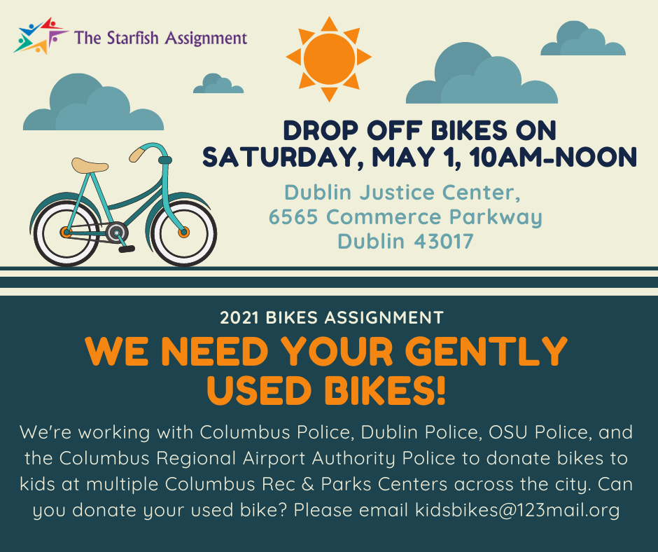 We need your gently used (or new) bikes to give to children in need. Please drop them off this Saturday, May 1, from 10am to noon at the Dublin Justice Center, 6565 Commerce Parkway in Dublin. Dublin police officers are working with Columbus Division of Police, The Ohio State University Police, and officers from the John Glenn Columbus International Airport to give bikes to hundreds of kids across the city and we cannot do it without you.