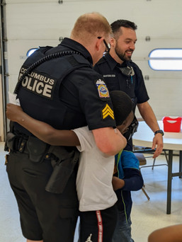 We're sure when Columbus Division of Police Officer Shawn Pepper woke up today he didn't think he'd be putting a deputy chief in handcuffs, but as he found out, anything can happen at a Books & Badges reading. His partner, Officer McCool, had the idea to let the kids at the Salvation Army summer program handcuff them, and as you can see it was great fun! Officer Pepper was happy to demonstrate proper technique on Starfish Board Member and CPD Deputy Chief Tim Becker.