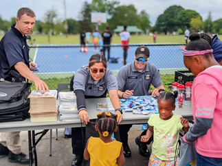 There were grins, hugs, high fives, and squeals of delight at Linden Community Center yesterday as we kicked off our Summer Block Party Series with Columbus Division of Police and Columbus Recreation and Parks Department. Linden Center Manager and Starfish Board Member Mario Dovell arranged for all sorts of games for kids, parents, and officers to enjoy together, including basketball, cornhole, and golf putting lessons. There was a prize wheel with some really fantastic prizes (that corner looked like Christmas it was so full of toys) and the 614cadets staffed a table where they gave away CPD swag and amazing books and items from our partners at the 2nd & 7 Foundation.